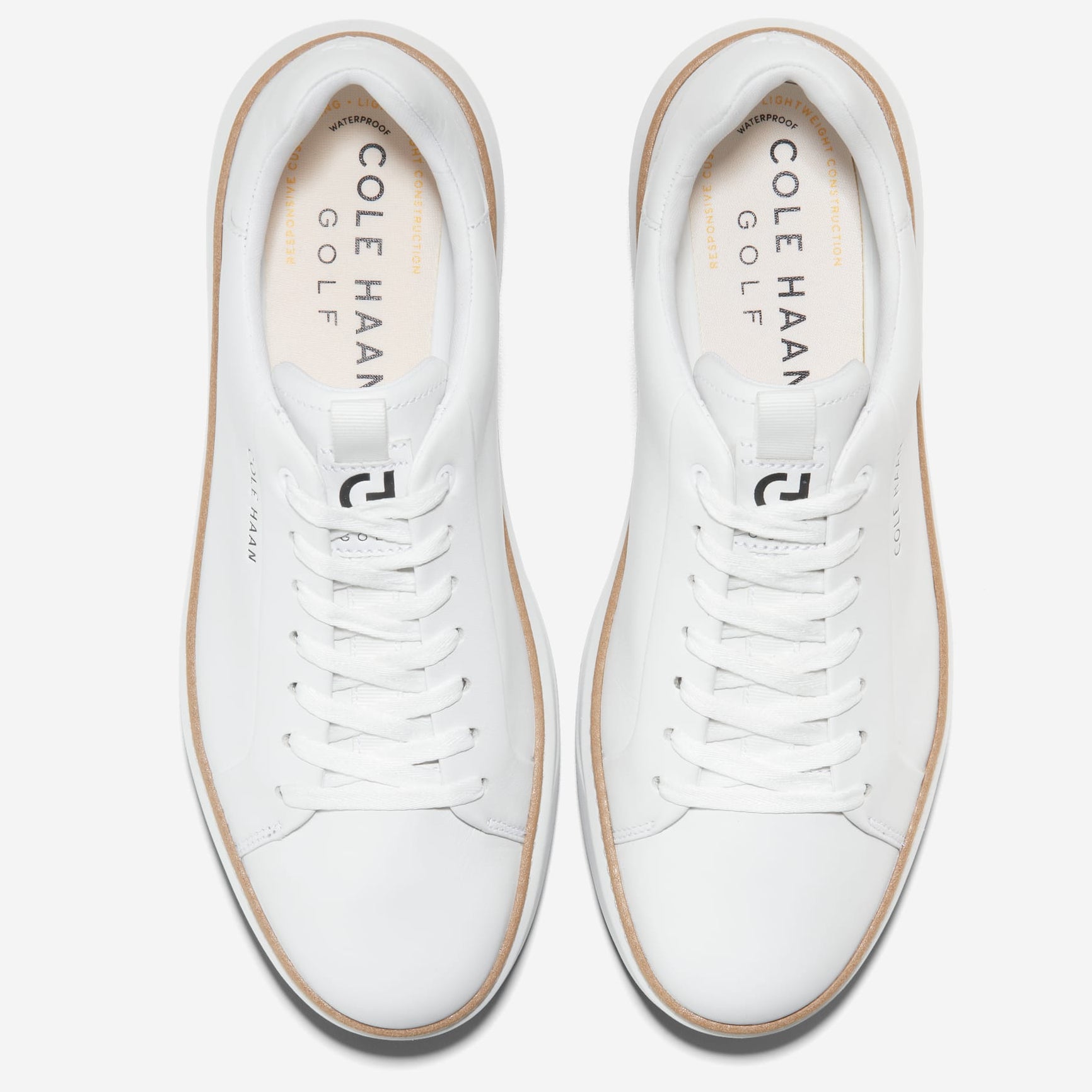 A golf shoe with follow-through: GrandPrø Topspin Golf in waterproof leather with sealed seams, a cushioned footbed with added padding at its heel and collar, plus a rubber outsole with traction without the use of old-fashioned spikes.