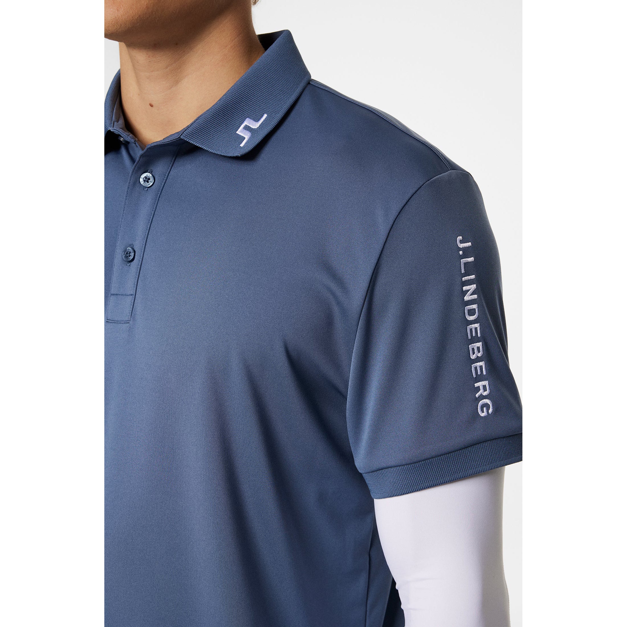 Signature Branding: Features Bridge embroidery at the collar and back, with a J.Lindeberg logo at the sleeve for a polished finish.