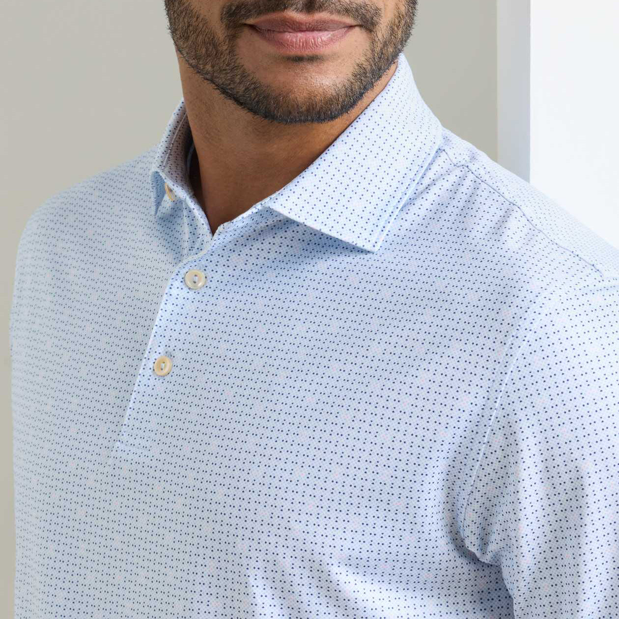 Peter Millar's Summer Comfort jersey polos are gold standards for softness and exceptional performance. These are packed with four-way stretch, wicking and UPF 50+ protection in their signature fabrication. This shirt features a custom-designed geometric print for added style. Finished with a spread collar and three-button placket.