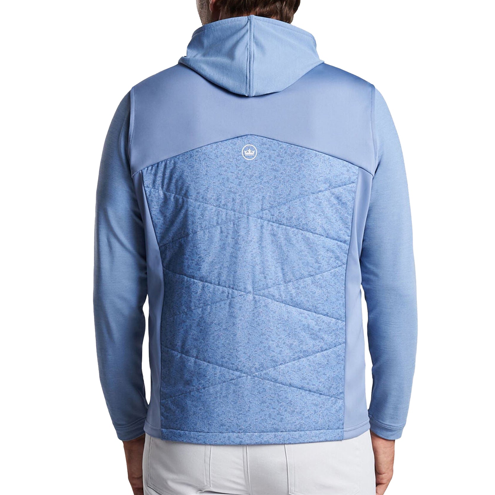 Elevate your golfing experience with the Peter Millar Venture Fuse Hybrid Gilet - a perfect blend of style and functionality for the modern golfer. The classic fit and sleeveless design provides a timeless silhouette, seamlessly combining sophistication and versatility on the course. Crafted with water-resistant properties and featuring triangle quilted panels, this gilet ensures you stay comfortable and protected, even in unpredictable weather. The lightweight insulation and four-way stretch fabric offer optimal freedom of movement, allowing you to swing with precision. Adorned with the iconic crown logo, the Venture Fuse Hybrid Gilet is a mark of quality and style, making a subtle yet impactful statement on the fairways.