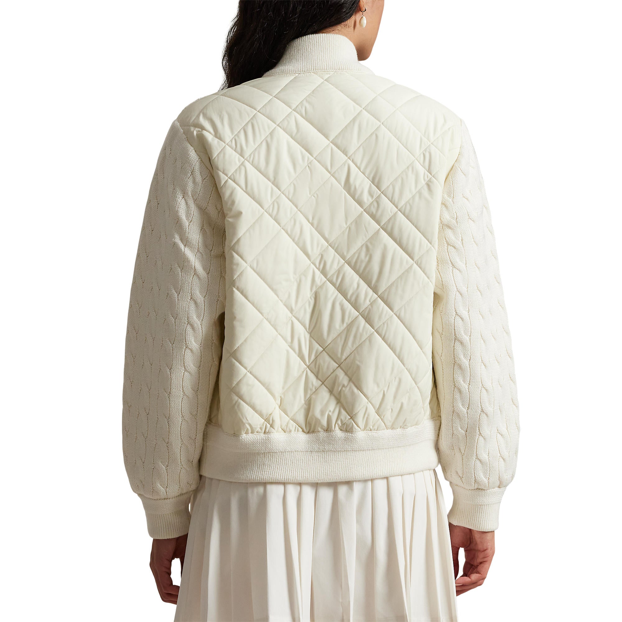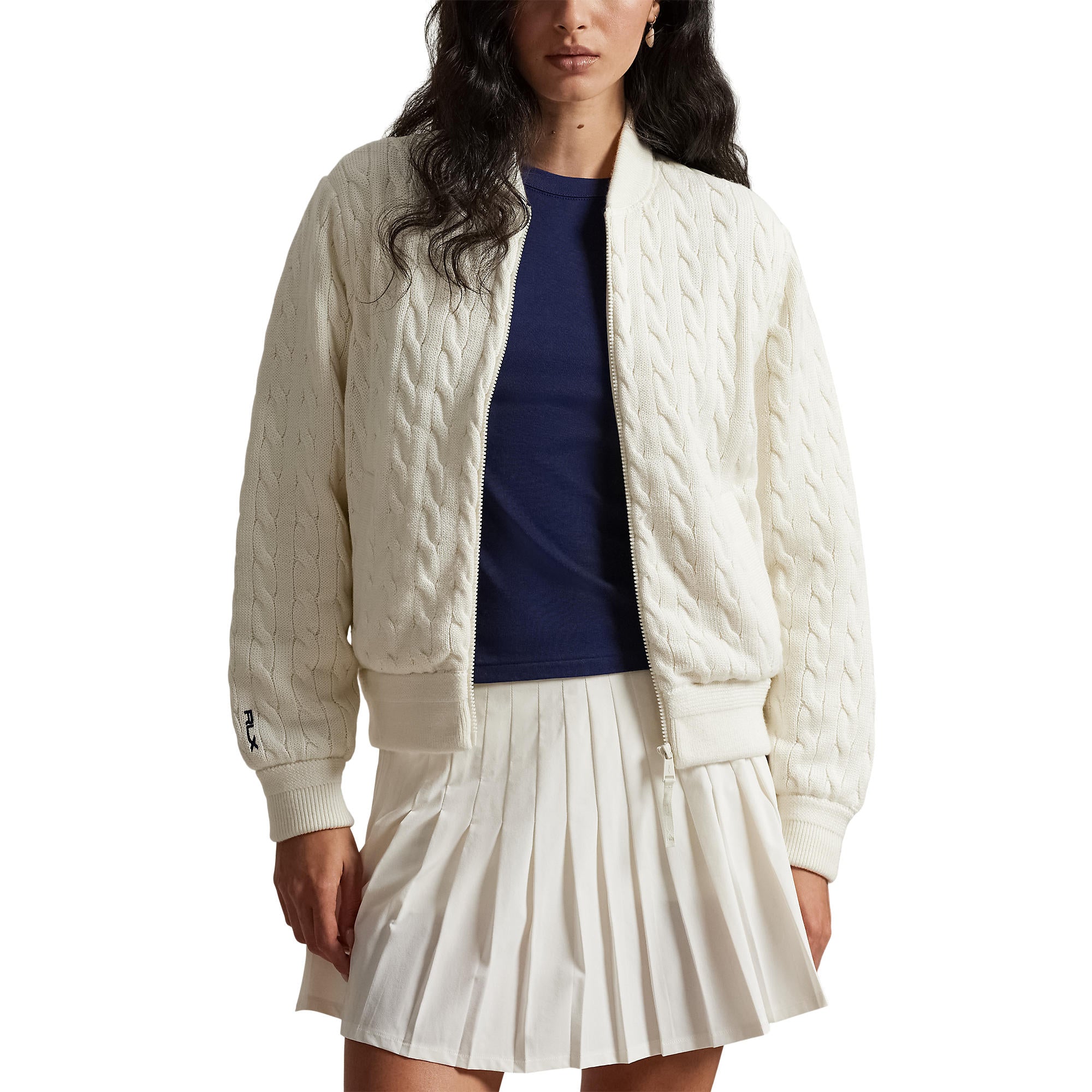 Innovative, Lightweight, and Performance-Ready The RLX Ralph Lauren Women’s Hybrid Cable-Knit Bomber Jacket merges classic bomber styling with modern performance technology. Featuring a cable-knit front with moisture-wicking COOLMAX® fibres and a lightly filled quilted back panel, this jacket offers breathability, warmth, and refined athletic style for all-season versatility.